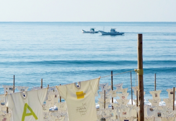 ピタリとTシャツがとまった おだやかな朝のひらひらの風景 向こうに見える海には船 仲良く2隻並んでいるのは、網を引っ張っているから。この時期はシラス漁のシーズンなのです。
