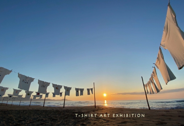 まだだれもいない 早朝のTシャツアート展会場。 海からあがる朝日が Tシャツを照らします。 おはよう! 今日もきっとよい1日。
