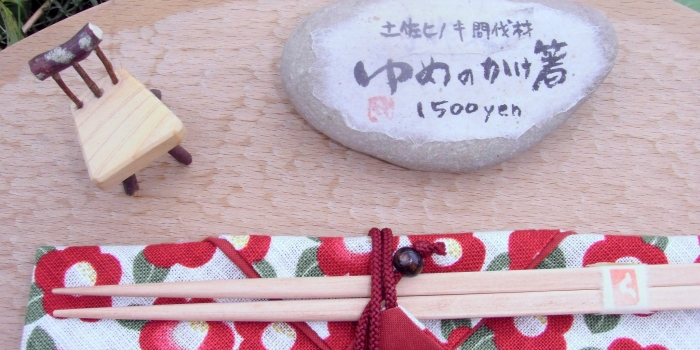 土佐ヒノキの間伐材をけずり、柿渋で仕上げるスプーンやおはし。